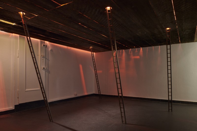 Bois de bardage, acier, vis, ampoules, gélatines, son (8min01, loop)